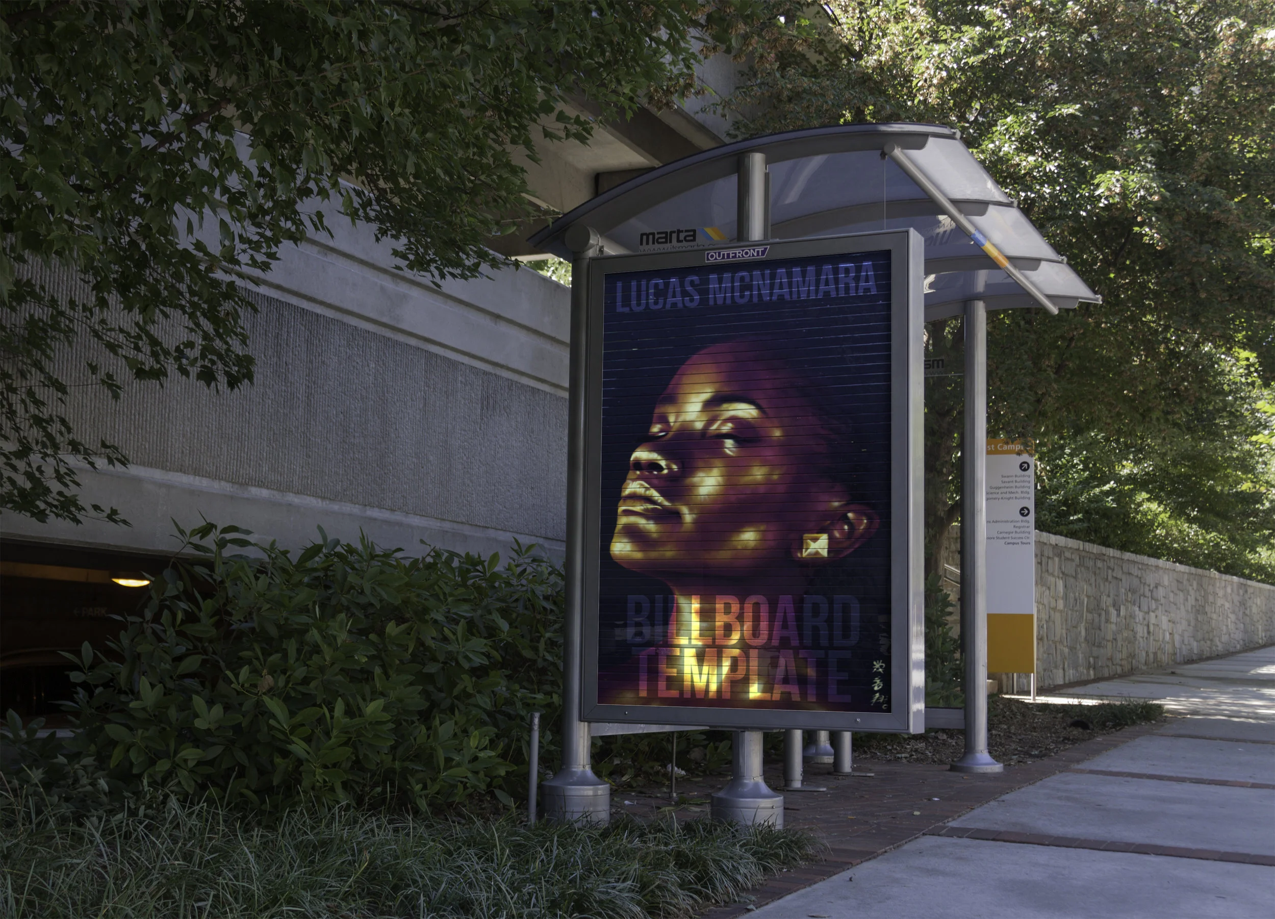 Original 3296x2376 px PSD mock-up of a bus stop billboard you can use to showcase your logo, advertisement, or buisness. For a flawless presentation, just place your design in the smart layer and adjust the reflections.